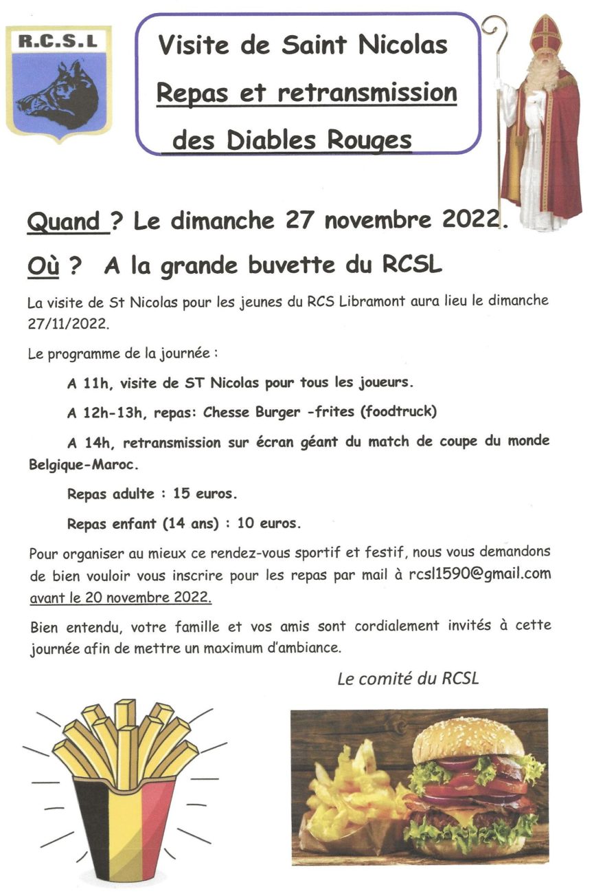 27Nov Visite de Saint-Nicolas 26 octobre 2022Evènements A 14h, retransmission de la rencontre de coupe du monde: Belgique – Maroc Du dimanche 27/11 à 11:00 au dimanche 27/11 à 17:00